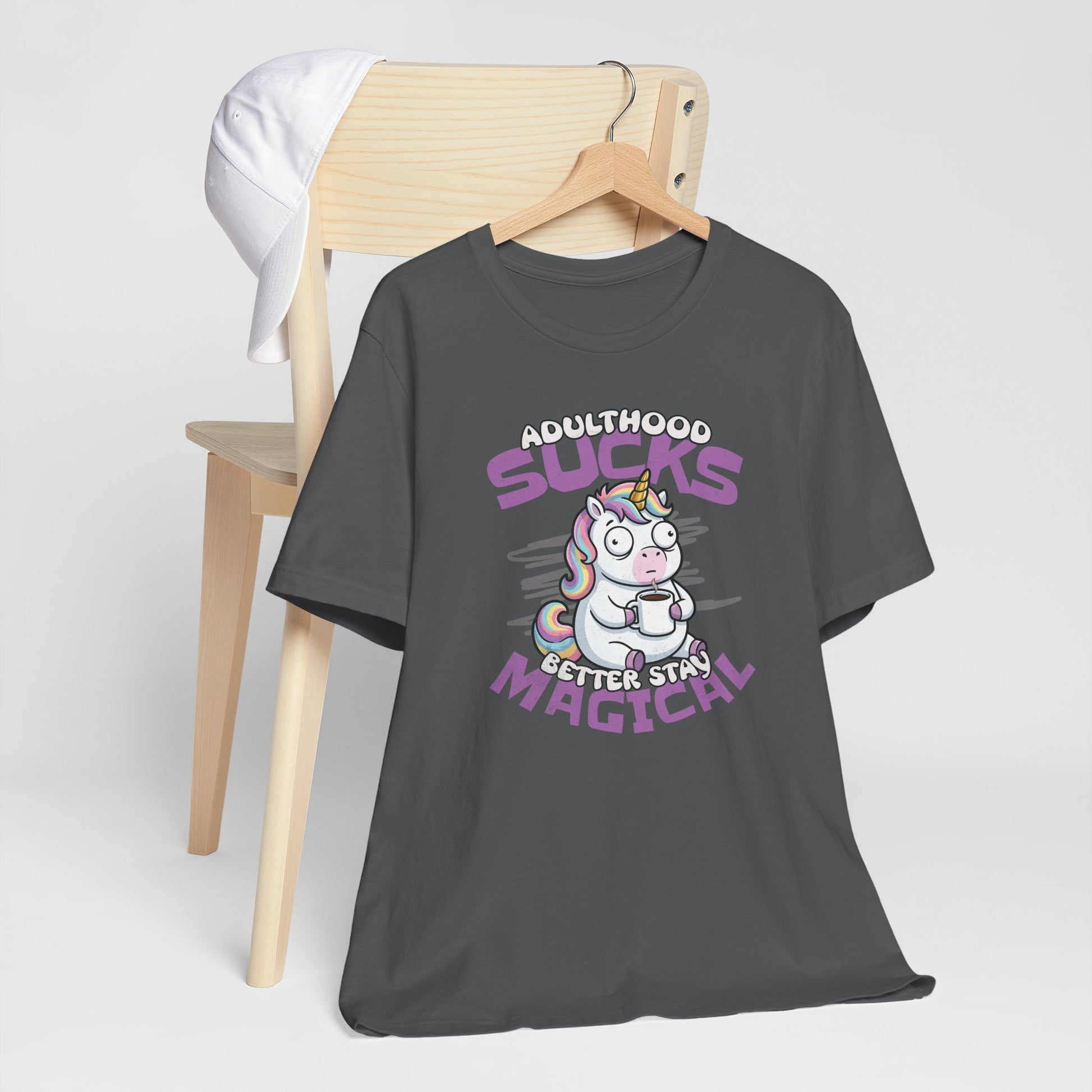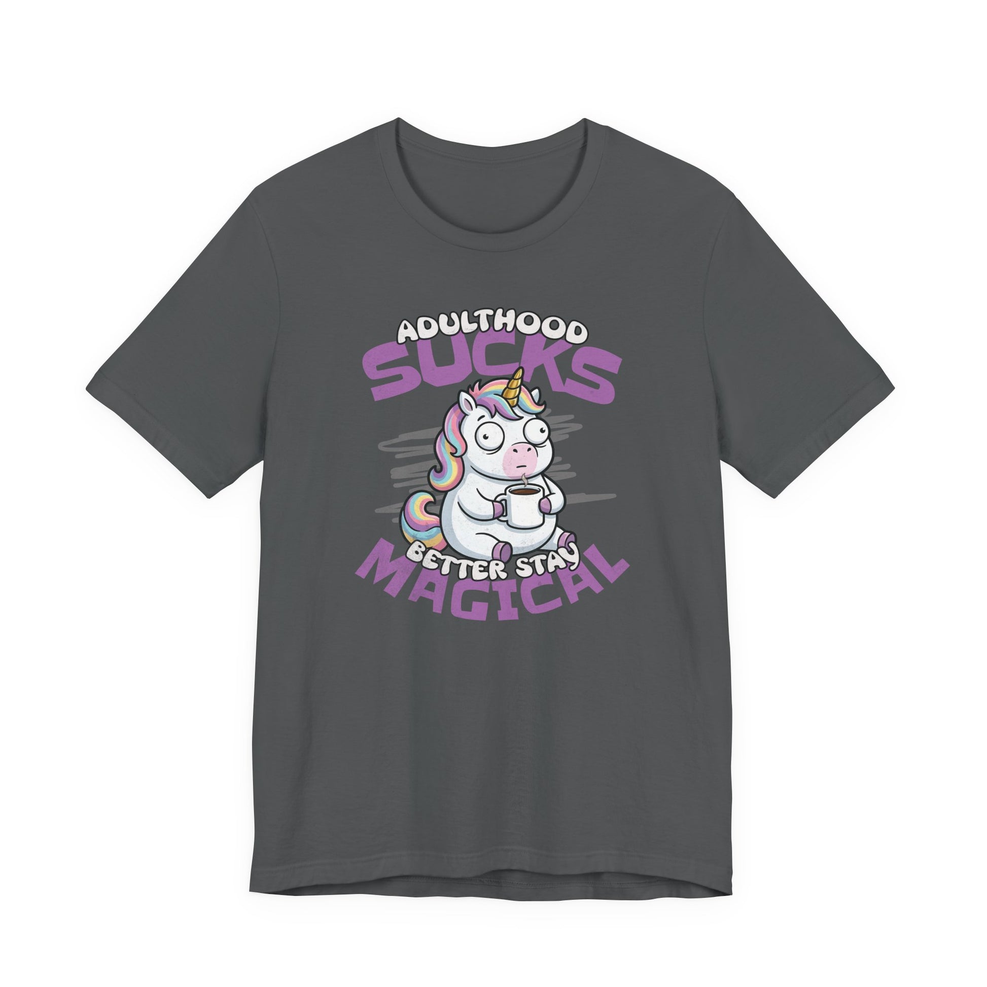 Tired of adulthood? This relatable unicorn is fueled by caffeine and pure chaos. Don’t grow up—it’s a scam. Stay magical and keep your coffee full.